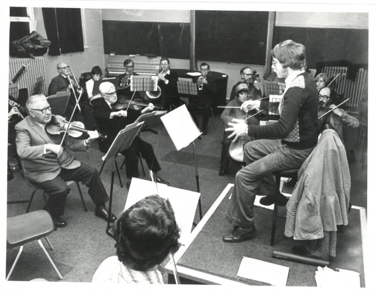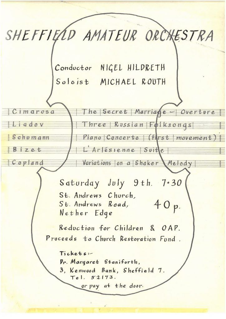 Not long after Tony Ward took over as conductor, the Polytechnic Orchestra, which met at the Collegiate Campus of what is now Hallam University and was conducted by Roger Hoyle, was discontinued. As well as students of Sheffield City Polytechnic, this orchestra included a number of local amateur players (some of whom played together previously in Malcolm Hanna’s evening-class orchestra at Abbeydale Hall) and these players now joined the Sheffield Amateur Orchestra at St Augustine’s Endcliffe under Tony Ward. His priority was to cater for players of quite modest ability, including some ‘late starters’, and to help them develop musically by playing enjoyably together. Tony Ward was the orchestra’s conductor for ten years. A pattern of informal concerts was established with audiences mostly consisted of friends and family.